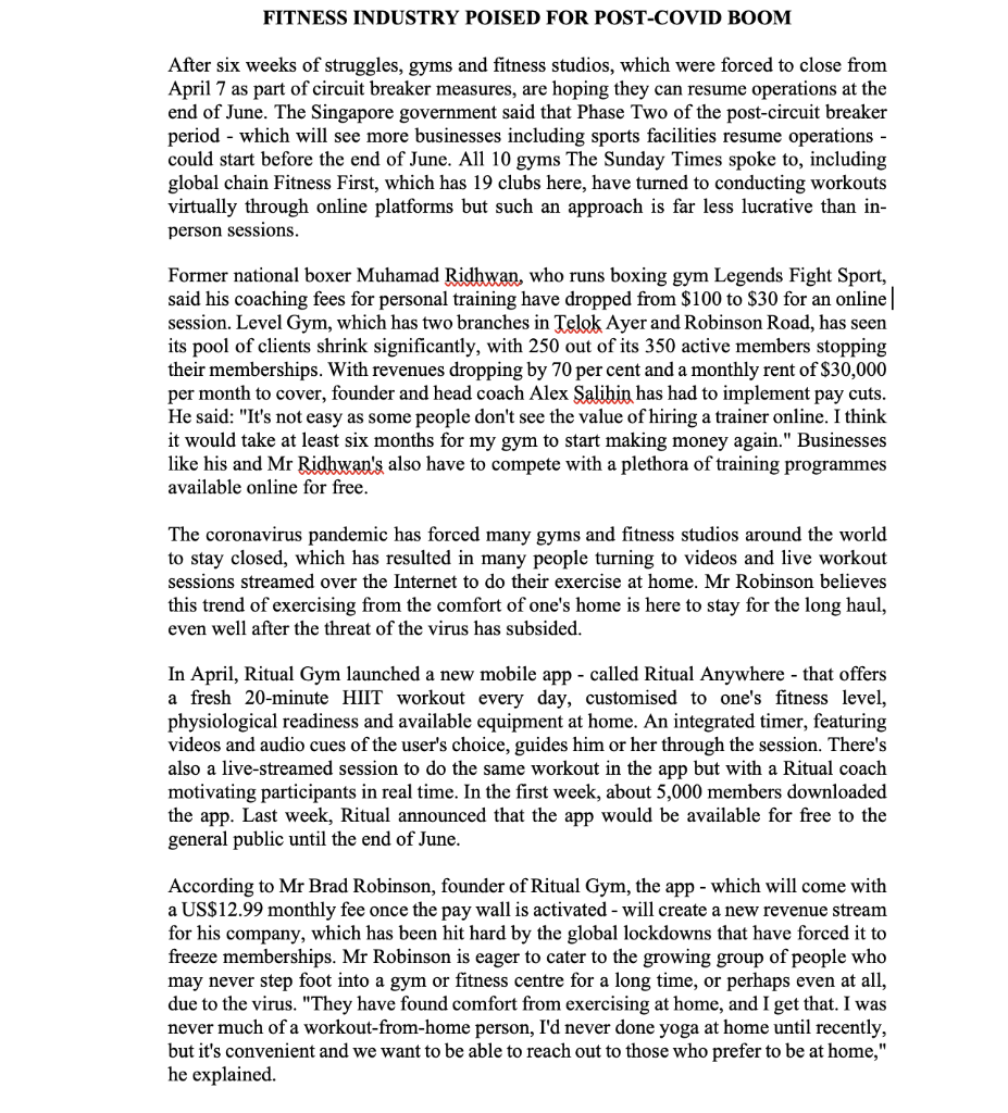 Solved Fitness Industry Poised For Post Covid Boom After Six Chegg Com